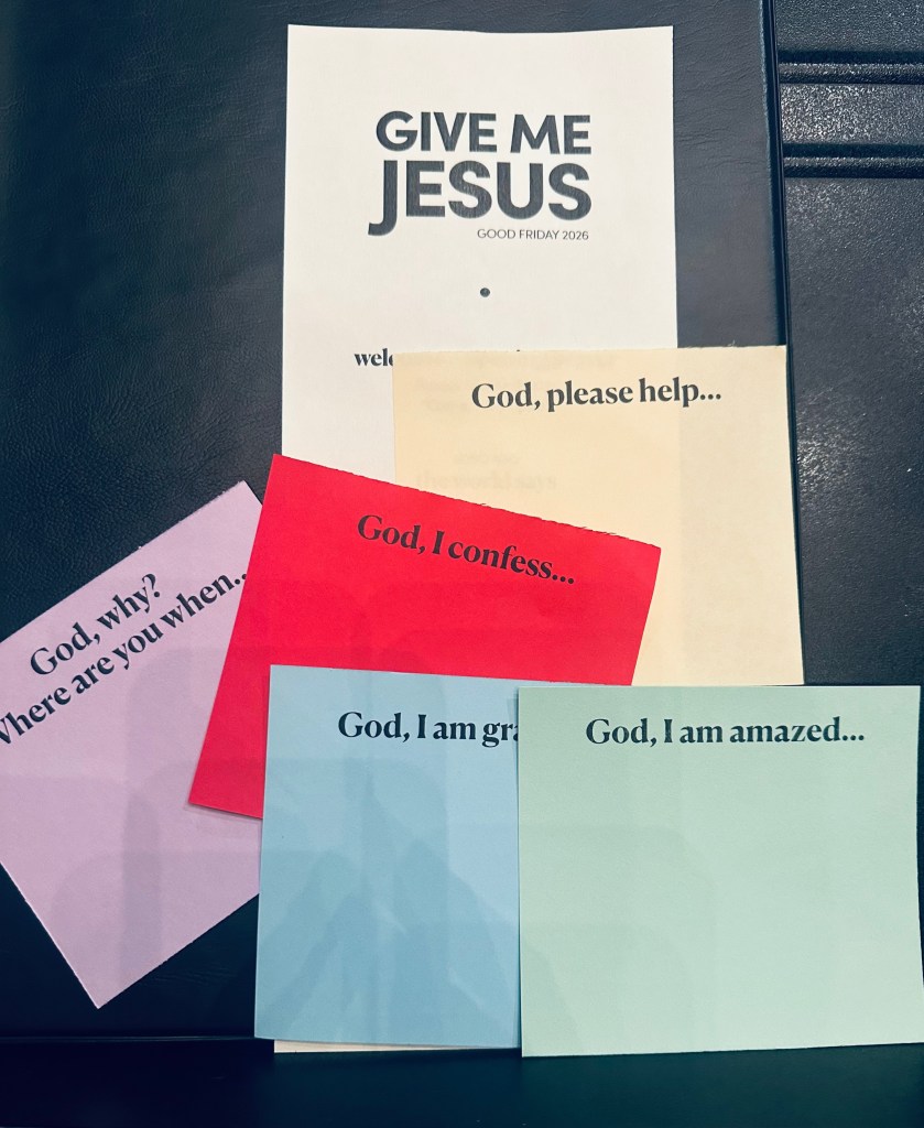 We’ll now be spending the next few minutes in silence. And in this quiet time, consider your prayers of help for yourself, your loved ones, the world, as well as what you’re grieving and frustrated about. Write those on the prayer cards that say “Help” and “Why?” Then, fold them in half when you’re done.